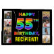 Den här roliga och öga-infångande födelsedagspressformaten visar LYCKLIG 55 BIRTHDAY, med ett färgstarkt regnbågsspektrum som inspirerar gradienten mönster, tillsammans med en personlig mottagare namn. Fotografierna till lämnat och högerna av det regnbågsmönstrade meddelandet på kortets framsida kan vara personlig, kanske med foton av mottagaren, mottagarens familj och vänner och/eller presentens avsändare. En glatt julklapp som den här kan vara ett roligt för att slå en present till någon som firar sin femtiofemte födelsedag. (Photography © Storytree Studios, Stanford, CA.) [~Z0000668]