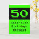 Den här roligten och nördfödelsedagskalendern med hälsningskortet har en stor grönts klassiskt datorspel stil nummer "50" på framsidan. Det innehåller också hälsning:s födelsedagsmeddelande "Lycklig 50:e födelsedagen" och ett namn som kan redigeras. Insidan innehåller ett redigerbart hälsning-födelsedagsmeddelande, eller så kan det kanske rensas och lämnas tomt om ett meddelande ska skrivas för hand i stället. Ett sådant här hälsningskort för fånigets födelsedag kan användas för att skicka önskemål till en datorprogrammerare, en vetenskapsman eller någon som tycker om datorspel och som firar sin femtioårsdag. [~Z0000430]