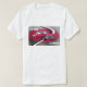 Femtiotalklassiker röda chevrolet och vitbil som visas på en röd bakgrund för cirkulär. I tillägg ett framåt tittar svartvitt nedslagdesignspring till och med designen. Registreringsskylten visar en chevy klassiker 1957.