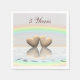 Pappra blöjor med min utformning av två trälhjärtan flytande på vatten under regnbåge. Texten säger "5 år".