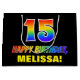 Den roliga, roligt- och färgfulla födelsedagskalematoden i presentsäcken har ett stort nummer "15" och meddelandet "GRATTIS PÅ FÖDELSEDAGEN,", som båda har en regnbågsspektrumövertoning som inspirerade mönster-färgning, tillsammans med en fet gult personlig mottagare namn. Bakgrunden är svart på färgad. En sådan här roligt-presentväska kan användas när en gåva eller present är ge för att hedra någons 15-årsdag. [~Z0000477]
