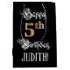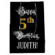 Den här opulenta och elegant presentsäcksdesignen innehåller budskapet "Lycklig 5:e födelsedagen", tillsammans med en anpassningsbar mottagare av namn. En del av budskapet finns i en lyxig text med skript-stil, det stora antalet "5th" har ett faux/imitation guld-inspirerat utseende mönster, och bakgrunden är färgadens svarta. En dylik födelsedagsäck kan vara ett respektabelt sätt att figurera en gåva eller present som ges för att fira någons femårsdag. [~Z0000560]