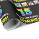 Den här roliga och roligt födelsedagstäckande pappra designen har ett stort nummer "15" med ett dynamiskt multifärgat regnbågsspektrum inspirerat gradienten mönster, plus meddelandet "Lycklig 15:e födelsedagen" och en personlig mottagare namn. Det finns även foton som kan vara personlig, kanske med foton av mottagaren, mottagarens familj och vänner och/eller presentens avsändare. Papper som detta kan användas när man slår in gåvor som ges till någon i firande på deras femtonde födelsedag. (Photography © Storytree Studios, Stanford, CA.) [~Z0000670]