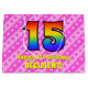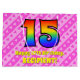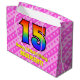 Den här lycklig och den glada 15:e födelsedagstidningens presentsäcksdesign har ett stort nummer "15" med ett regnbågsspektrum som inspirerar till gradient mönster. Det innehåller också budskapet "Lycklig 15:e födelsedag" och ett redigerbart namn. Bakgrunden har en ljus rosa och mörk rosa rand mönster som innehåller levande hjärtformer av rosa. Sådana presentsäckar kan användas när man slår in presenter eller presenter som ges för att hedra någons femtonårsdag. [~Z0000414]