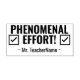Denna positiva gummerade stämpeldesign har det motiverande återkopplingsmeddelandet "FENOMENALT JOBB!" och en personlig lärares eller utbildares namn. Den har också en dekorativ bock. Den kan användas av en skollärare, utbildare eller handledare vid betygssättning av studenters arbete för att indikera att en student har gjort ett exceptionellt jobb.