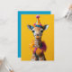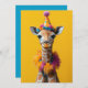 En charmig baby-giraff klädd för en fest, iförd en festlig födelsedagsmössa med färgglada mönster och ludna dekorationer. Giraffen bär en luddig, mångfärgad fjäderboa och står mot en starkt gul bakgrund, vilket skapar en glad och fantasifull scen.