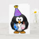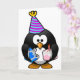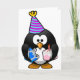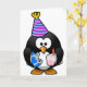 Rolig pingvin som går på fest med tårta och födelsedagspresent.