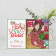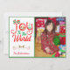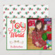 Skicka detta ljusa och färgglada julkort till dina vänner och familj och ge dem en glad stund! Designen har typografi som lyder "Glädje åt världen" och ordet Glädje är festligt dekorerat i rött, guld och grönt med ornament, rosett och julgran. Ladda upp ditt favoritfoto av familjen eller barnet och gör det personligt med ditt namn och du är klar! Baksidan av kortet har ett godisrandigt mönster i glittrande (falskt) glitter. Massor av fler designs i min butik på www.zazzle.com/digiscrapthat