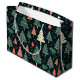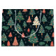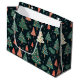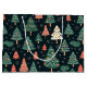 Sömlöst mönster av stiliserade gröna och korall julgranar spridda mot en mörk bakgrund med vit spridd snö eller konfetti.