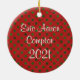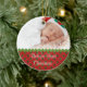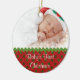 Söt bebis första jul prydnad i rött med gröna prickar. Den övre halvan av framsidan är redo för din bebis fotografi och den vita texten i skrivstil, på framsidan och baksidan, är redo att anpassas. En underbar idé för att minnas ditt barns första jul, och en bra presentidé för mor- och farföräldrar.