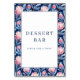 Denna bröllopsdekoration har en livfull blomsterdesign med stiliserade rosa proteor och gröna blad mot en djupblå bakgrund, vilket skapar en inbjudande och glad estetik. Den centrala vita fyrkanten är inramad av en tunn marinblå kant och visar fet seriffstil som lyder "DESSERT BAR" ovanför frasen "PLEASE TAKE A TREAT!" i ett ljusare typsnitt, vilket ger elegans åt det lekfulla temat. Den övergripande stämningen är varm och festlig, perfekt för att välkomna gäster att unna sig söta godsaker på alla firade evenemang.