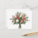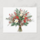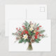 Det här vackra julkortet med plana bilden visar en frodig akvarellbouquet som perfekt fångar vinterns väsen. Arragemanget är rikt på röda järnekar, vita vinterblommor, mörkt granna tallbarr och naturliga kottar, allt sammanbundet med rustik tråd. Den detaljerade illustrationen ger ett elegant och sofistikerat sätt att önska God Jul. Det är perfekt för dem som älskar traditionella färger och detaljerad naturinspirerad konst.