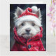 Denna bedårande West Highland White Terrier är redo för högtiden! Klädd i en mysig tomtehatt och röd vinterrock fångar denna lilla valp semesterns anda perfekt. Med snö som försiktigt pudrar dess päls och rock är detta vintervunderlandsmoment fullt av värme och charm. Westies uttrycksfulla ögon och knappnosa lägger till ett extra lager av sötma till denna högtidsscen.