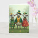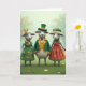Denna design visar tre prydd får som står tätt ihop mot en mjuk, vårgrön bakgrund, deras milda leenden och snett riktade blickar antyder en söt vänskap med en antydan till romantik 💚. Fåret i mitten bär en vit ullrock med en smaragdgrön kavaj, en senapsgul väst och en grön flugsmällare, allt krönt med en hatt i tomte-stil med en guldbeslag. Till vänster bär ett honfår en grön klänning dekorerad med orange- och gula prästkragar, en stickad krage och en gul blomma instucken i sin lockiga ull medan hon lutar sig in lite. Till höger bär ett annat honfår en terrakotta-orange klänning med detaljer av blomknoppar och en liten grön béret, snedställd mot mitten som om de delade ett internt skämt ☘️. Ljuset ser ut som tidig morgon, mjukt och diffust, och formar scenen till en mjuk oskärpa bakom dem. eventuell hälsningst