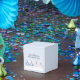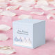 Liten presentask, 5 cm x 5 cm. Utformad med en magisk juldesign. Julgranskulor som sitter tillsammans i vit snö. Bakgrunden har ett vitt bokeh-mönster (suddiga ljus) med fallande snöflingor. Fångar perfekt julens magi och under.