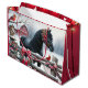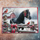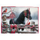 julklapp. En vattenfärgad illustration av en scen på en rustik gård med en svart häst och kardinal och ett trästängsel som dekoreras i gräs på koner, bär och trädgårdsmark en vinterdag.