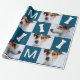 Festivt vitt hund med ben behandlas på en blå helgdag i julen papper med fotokollage och hårigets väns monogram.