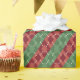 A repeating diagonal argyle pattern featuring layered diamond shapes in classic red and green tones.