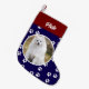 Festive Cute Hund Pet Photo Small Jul Stocking with hund paw print mönster on blue bakgrund. Anpassa den med ditt lilla namn och husfoto.