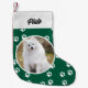 Festive Cute Hund Pet Photo Small Jul Stocking with hund paw print mönster on grönt bakgrund. Anpassa den med ditt lilla namn och husfoto.