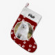 Festive Cute Hund Pet Photo Small Jul Stocking with hund paw print mönster on mörk red bakgrund. Anpassa den med ditt lilla namn och husfoto.
