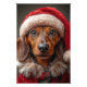 Bilden visar en vacker dachshund som är klädd i festive attire och som har en röd hatt med fluffy white trim. Hund stora, uttryckliga ögon och glansigt svarta näsa är hörnstenarna i närbildsbilden och skapar en hjärtslitande och charmerande helgdag vibe. Dachshund har också en mysigt rödklädsel med faux päls-halsband, vilket bidrar till scenens festliga och varma atmosfär.