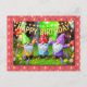 A joyful and colorful digital illustration featuring three garden gnomes celebrating a birthday in a sunlit meadow. The gnomes, dressed in yellow, blue, and purple outfits with star-patterned hats, stand with their hands raised in celebration beneath a gold "HAPPY BIRTHDAY" banner. The scene is decorated with glowing string lights and surrounded by vibrant wildflowers and mushrooms.