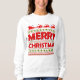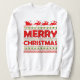 Den här vita tröjan har en design som liknar en traditionell julsötare. Ord "GOD JUL" visas tydligt i rött, omgivet av festligt mönster, inklusive renar, Julgranar, snöflingor och geometriska former i rött, grönt och guld. Ovanför texten är Jultomten i sitt slift som dras av renar skrivet i rött silhuett.