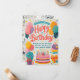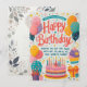 Kortet har en färglös och festlig utformning med frasen "Grattis på födelsedagen" på framträdande plats i mitten. Den är försedd med ballonger, muffinsar, en födelsedagskalas med ljus och en presentlåda. Bakgrunden är stjärnor och punkter, som bidrar till den berömda atmosfären.
