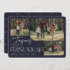Vår festliga och elegant Hanukkah-kortdesign är det perfekt sättet att visa tre av dina favoritfoton i familjen. Vågrät- eller landskapsinriktad design har "Joyous Hanukkah" i vit typografi och handskript, med din familj namn under på en midnattblå bakgrund.