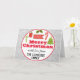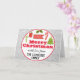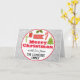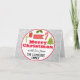 Festive helgdag-kort med silver glitter-gnistor gräns och vit bakgrund. Ord "God jul" är skrivet i ett fet rött skript. Kortet är dekorerat med söta små illustrationer som Julgran, röda och grönt polkagrisar, gåva och heta löv. Grund på klistermärket är ord "med kärlek från" och namn efternamn för familjen.