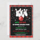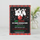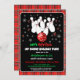 This festive holiday bowling party invitation features bowling pins with red glitter and a red bowling ball with snowflakes pattern on a cheerful red plaid background the perfect design to spread seasonal fun and party cheer.