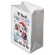 A vibrant Santa sack adorned with a whimsical holiday snowman featuring a friendly ghost, a Christmas gift, and a gingerbread cookie. Snowflakes softly fall around, creating a joyful atmosphere that captures the spirit of the holiday season.