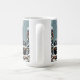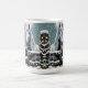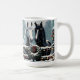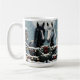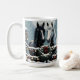 Söt julkaffe kopp med grafik av en vit häst och en svart häst som står på en trägatt som dekoreras i helgdag och söt twinkling jul ljus som är täckt i snö. Hästarna görs i en tecknad tecknad, bok popart stil för att väcka en nostalgisk känsla.