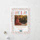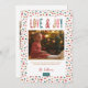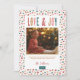 Modern anpassningsbar tryckte ut julfotokort med en enkel DIY-mall för anpassning. Den här festliga designen har färgstark typografi och en söt abstrakt punktbakgrund i rött, grönt, guld och rosa färg. Lägg till dina familjefotografier, personliga hälsning, namn och året. Använda verktyg för att redigera typsnitt och färg. Baksidan har utrymme för att lägga till fler foton och text.