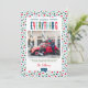 Modern anpassningsbar tryckte ut julfotokort med en enkel DIY-mall för anpassning. Den här festliga designen har färgstark typografi och en söt abstrakt punktbakgrund i blått, rött, grönt och färg. Lägg till dina familjefotografier, personliga hälsning, namn och året. Använda verktyg för att redigera typsnitt och färg. Baksidan har utrymme för att lägga till fler foton och text.