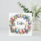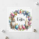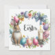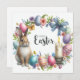 Detta är en festlig illustration av Påsk. Bland de centrala inslagen finns: en söt, brun knipa, en samling Påskägg av pastel-färgad, olika blommor och blad, ett tänt ljus i en ornathållare, ett band och en fjäril som ytterligare förbättrar den högstämda och vismiska atmosfären. Texten "Glad påsk" visas tydligt i elegantens skript.