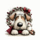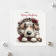 Celebrate the season with this cheerful holiday design featuring a fluffy dog in a red scarf sitting in front of a Christmas wreath adorned with pinecones, red ornaments, and a bold red bow. A playful snowman with a red headband adds charm to the wintry scene, surrounded by cozy pine accents. The soft colors and whimsical composition evoke warmth, joy, and festive spirit—perfect for themes of Christmas, pet lovers, and seasonal celebration. The reverse side features the greeting “Paws, Pinecones & Holiday Cheer!. Wishing you tail wags, cozy hugs, and a season wrapped in joy. along with the senders name.