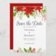 Den klassiska röda julen och grönten jul i bröllop spara datum har ljusa poinsettiska blommor vid högerna grund i inbjudan och häckbär och grönska på den översta lämnat. En festlig och smart botanisk inbjudan till ett helgdag bröllop med elegant-skript.
