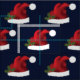 Desteis ursprungliga illustration av en röd och vit tomtehatt i färg tillsammans med en julklapp/en gemensam hollfabrik. Bakgrunden till färg är mörk blått.