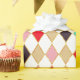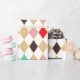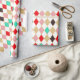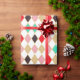 Roligt, romb mönster i rött, akvatisk grönt och mjuk rosa, beige, mörk brun med faux guld gräns på vit bakgrund, för inslagning av julhelg, födelsedag, babydusch eller något annat tillfälle.