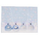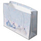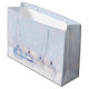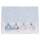 Stor presentväska med en magisk juldesign. Julgran dekorationer sitta tillsammans på lite vit snö. Bakgrunden har en vit borkeh (suddig ljus) mönster med fallande snöflingor. Fångar perfekt julens och magiska.