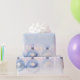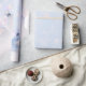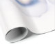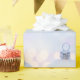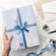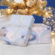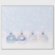 Papper med en magisk juldesign. Julgran dekorationer sitta tillsammans på lite vit snö. Bakgrunden har en vit borkeh (suddig ljus) mönster med fallande snöflingor. Fångar perfekt julens och magiska.