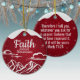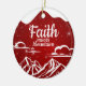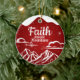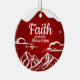 Festive Snowy Motivational Biblical Text Ceramic Ornament. Elevate your Christian holiday with this devotional berry red snow-capped Christmas decoration, featuring a serene mountain scene and the uplifting biblical phrase "Faith Moves Mountains" in crisp white on the front. Sparkling accents resembling falling snow creates a magical winter wonderland vibe. Flip the Xmas decor over to reveal the same captivating background with the inspirational Bible Scripture verse: "Therefore I tell you, whatever you ask for in prayer, believe that you have received it, and it will be yours -- Mark 11:24" in customizable white words—perfect for personalizing. Crafted for lasting joy, this timeless piece blends holy spirit and cheer seamlessly.