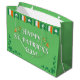 Den här presentpåsen i grönten har den irländska flagga buntbanderoll, en vit "Lycklig St. Patrick's Day"-text, och schampar.