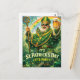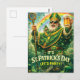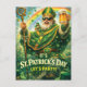 A vibrant and joyful digital illustration celebrating St. Patrick's Day. The artwork features a cheerful St. Patrick figure wearing a traditional green miter and robes, paired with modern sunglasses, holding a golden staff and a frothy glass of beer. He is surrounded by a festive atmosphere of falling shamrocks, gold coins, and a brilliant rainbow against a sunny sky. The bold text "IT'S ST. PATRICK'S DAY LET'S PARTY!" is prominently displayed.