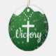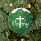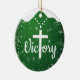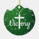 Festive Starry Green Devotional Holy Spirit Starry Green Ceramic Ornament. Enhance your decorations with this Xmas gift that radiates faith and holiday cheer. The front showcases the white cursive word "Victory," incorporating a prominent large Cross on a beaded necklace in place of the letter T, against a vibrant green background adorned with stars cascading down both sides for a magical winter sparkle. On the back, the same enchanting background presents the timeless Bible verse John 3:16: "For God so loved the world, that he gave his only begotten Son, that whosoever believeth in him should not perish, but have everlasting life," in white customizable text for a personal flair. This religious hanging decor embodies the holy spirit, uplifting worship, and inspirational teachings of Jesus Christ from the testaments, functioning as a sacred writing tag or present marker. As a custom keepsake highlighting doctrine, divine passages, and the word of our Lord, it's suited for Christian season adornments. With editable and personalizable features, tailor this festive, uplifting design to reflect your devotion. Additionally, transfer this versatile sacred motif to your choice of many products on Zazzle, such as apparel, mugs, or more, for boundless inspirational possibilities. Personalize yours today and illuminate Christmas with divine wonder!