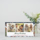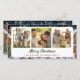 Den här julkortsdesignen har en festlig och picturesque snowy-byscen under julhelgen. På kortets framsida finns tre dedikerade utrymmen där du kan ladda upp dina egna familjefotografier och lägga till en personlig beröring till dina helgmöten. Ovanför de här fotokortplatserna är "God jul" elegant inskrivet. Byn är vackert prydad med många Julgranar, ljus och prydnadsföremål. Byggnad har mycket designat, tak täckt av snö och varma, glödande fönster som skapar en mysigt och inbjudande atmosfär. Man ser hur människor ägnar sig åt olika typer av festlig verksamhet, såsom att bära gåvor och njuta av den glädjande ambitionen. Mörken himmel är fylld med stort, glödande snöflingor, vilket ökar scenens magiska och sereniska atmosfär.