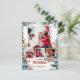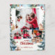 Festivt och färglöst fotografikkort för helgdag med tre kvadratiska foton med större bakgrundsbild på en bakgrund av söta vintertäckta julburar med snö med en dekorerad gräs träd gräns. Innehåller redigerbar fält.