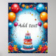 Färgglada ballonger och konfetti omger en lagerfödelsedagstårta med ljus mot en livfull blå bakgrund och skapar en livlig feststämning. Perfekt för födelsedag, fest och festliga designkoncept.